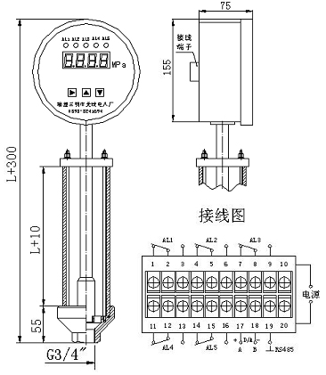 例:表示量程150mm,隔離膜片316L不銹鋼接口,數(shù)碼管LED顯示,2個接點輸出,G3/4鋁合金,4~20mA輸出,工作電源AC/DC220V