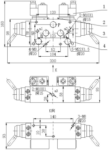 O---通往排氣口,&nb, sp; K向圖中的140(以中心線各70mm、38的三個孔均為安裝固定的M8螺絲孔.