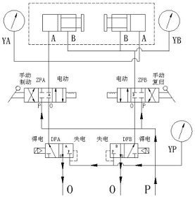 、當(dāng)復(fù)歸電磁閥(正面右)通電,制動電磁閥(正面左)不通電;壓力氣從P腔進(jìn)入電磁閥到手動轉(zhuǎn)閥至工作腔B,工作腔A通向O,實(shí)現(xiàn)自動復(fù)歸;復(fù)歸電磁閥失電,復(fù)歸腔氣體從0腔排出。