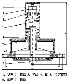 用螺絲刀旋開(kāi)序號(hào)5的兩個(gè)緊定螺釘,拆開(kāi)序號(hào)1護(hù)罩,按開(kāi)啟真空度要求,固定序號(hào)4軸,松開(kāi)序號(hào)2螺母,調(diào)整好擋塊,調(diào)完畢并緊定序號(hào)2螺母,蓋上序號(hào)1護(hù)罩,鎖緊序號(hào)5的兩個(gè)緊定螺釘。彈簧作用力在真空為5-10KPa時(shí)即能打開(kāi),當(dāng)真空值超過(guò)20-30KPa時(shí)閥門(mén)全開(kāi),當(dāng)閥門(mén)下部有水,靠水的浮力自動(dòng)關(guān)閉。