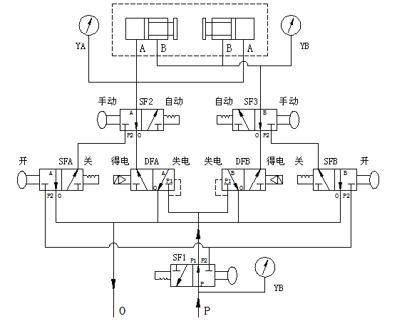 自動(dòng)剎車(chē):電磁閥線圈處于失電狀態(tài),手拉閥SF1、SF2、SF3往里推至自動(dòng)狀態(tài),過(guò)濾后壓縮氣體從進(jìn)氣腔(P腔)進(jìn)入集成塊。當(dāng)接收到停機(jī)指令時(shí),制動(dòng)電磁閥DFA得電開(kāi)閥,使壓縮氣體進(jìn)入制動(dòng)腔(A腔), 從而實(shí)現(xiàn)對(duì)制動(dòng)器的投入, 加速機(jī)組的制動(dòng)停機(jī);